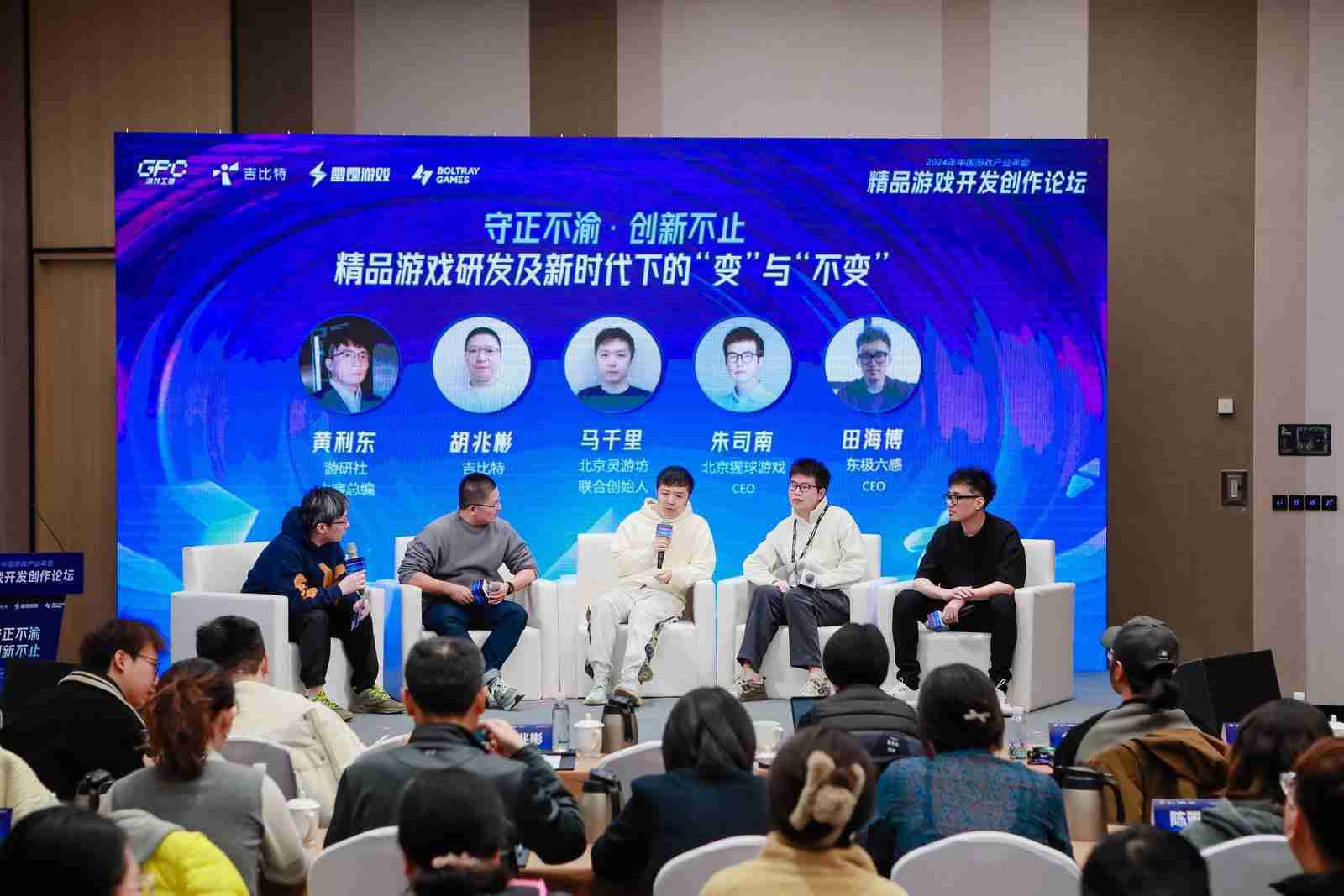 圆桌对话环节,,在游研社内容总编黄利东的主持下,,,918.comCTO胡兆彬、、北京灵游坊联合创始人马千里、、、、北京猩球游戏CEO朱司南、、东极六感CEO田海博等四位嘉宾围绕“守正不渝、、创新不止——精品游戏研发及新时代下的‘变’与‘不变’”这一主题分享了各自在精品游戏开发理念及工程能力搭建方面的见解和经历,,,并就行业变化下游戏人需要坚守的理念等展开交流探讨。。。。
