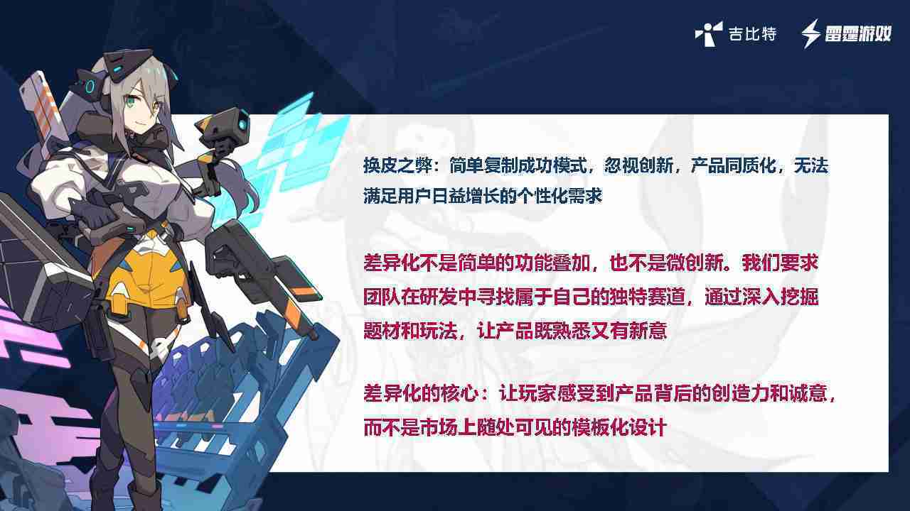 在我们内部是这么定义差异化的。。。首先,,差异化不是简单的功能叠加,,更不是换皮。。。。只是换皮,,,,产品无法提供有效的市场价值。。内部经常说差异化的产品不是为了迎合市场,,,,而是找到一个自己独特的表达方式,,,在研发中找到属于自己的细分赛道和独特赛道,,前提是需要对这个题材有足够的深入、、、、挖掘,,,,对玩法有足够深入的理解,,,,让产品看起来既熟悉又有新意。。。