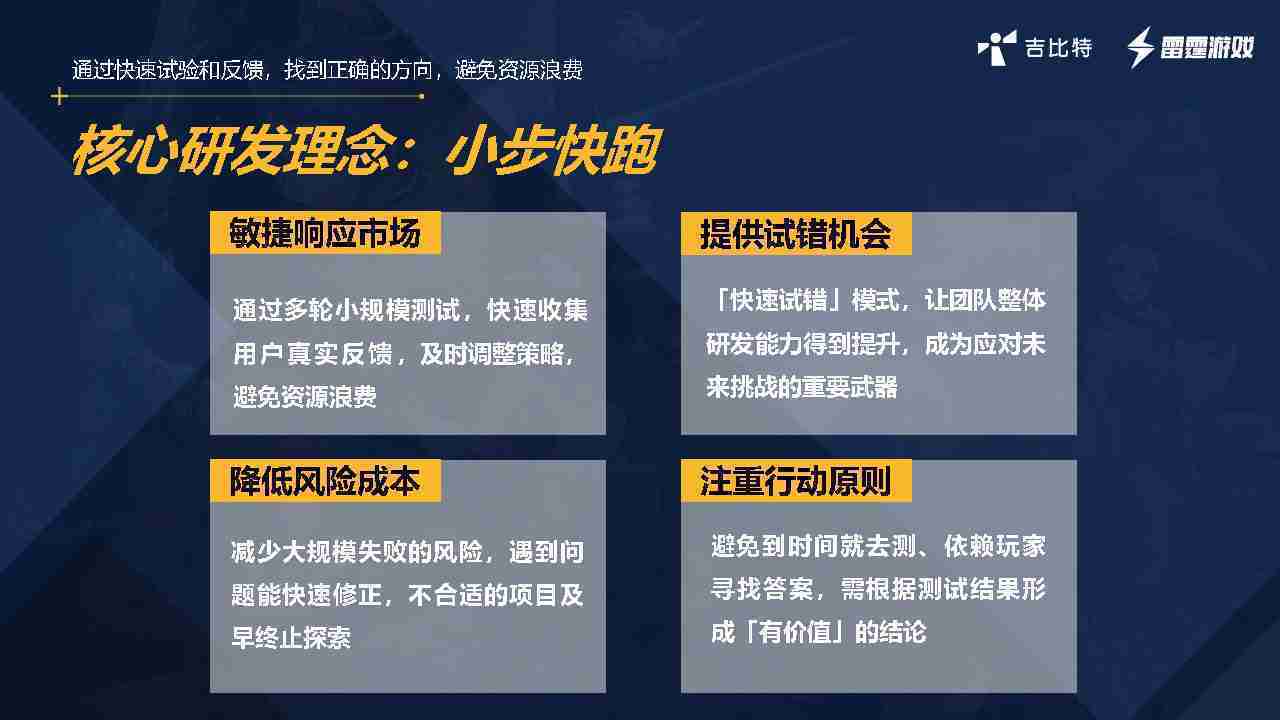小步快跑不是找答案,,而是验证答案。。。。我们之前有项目是这样的,,有些制作人会有几个方向觉得都可以做,,,但是不确定做哪一个,,会选择几个都做,,做完拿到市场跑,,,,跑出哪一个更好,,,基于这个再做后续的研发和拓展。。。但这种情况最容易出现一个问题,,可能被玩家裹胁,,,玩家说这个点不错、、、那个点不错,,到底听还是不听,,不听感觉是无视玩家的反馈,,听的话,,可能自己没想清楚导致研发思路发生偏颇。。。。所以针对这一点后面自己复盘整理,,,,发现制作人自己心里要有数,,,,要做自己觉得好玩的,,,而且明确知道这个东西是你想做的,,,然后拿到市场验证这个答案是不是对的,,,而不是拿一堆答案找哪一个答案更好。。