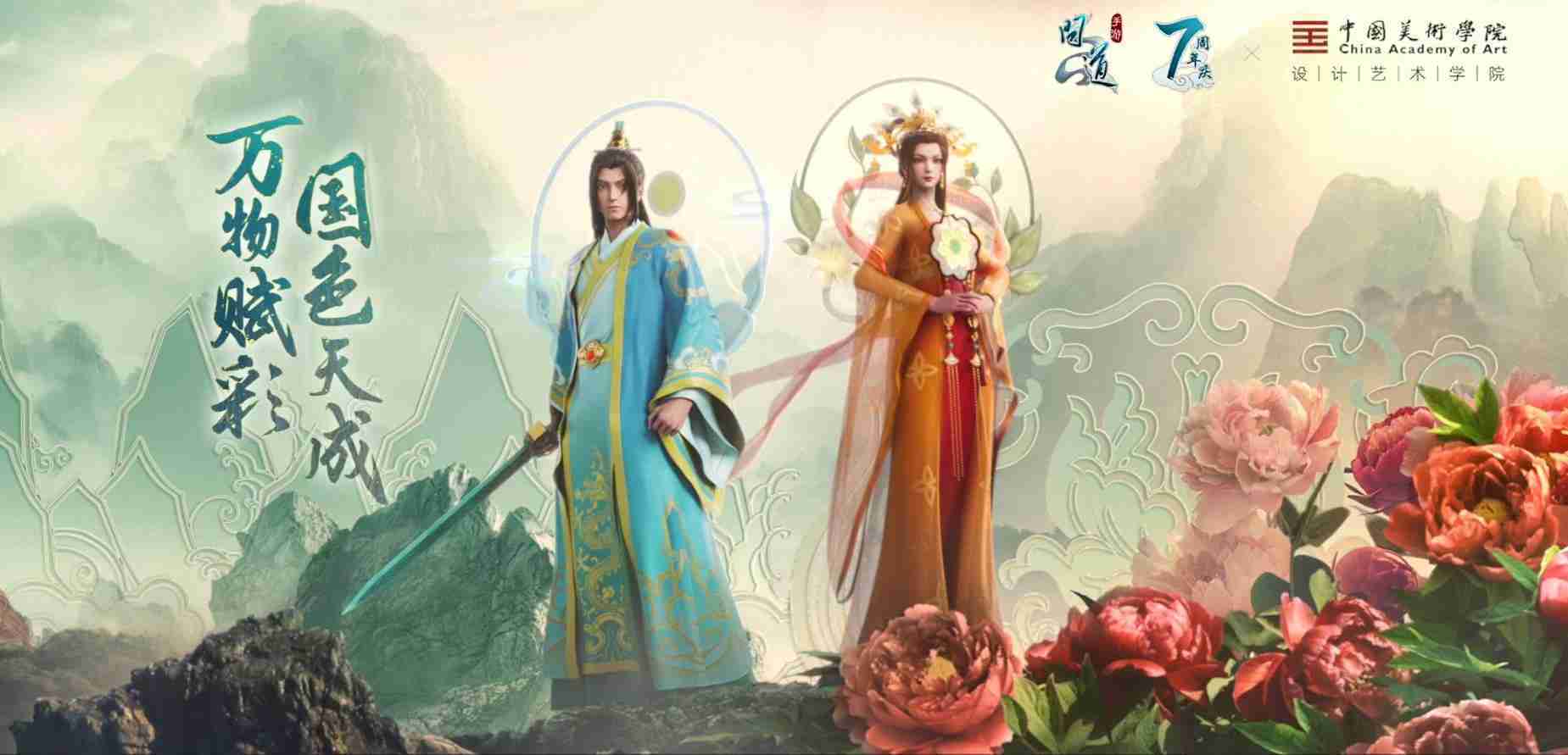 2023年4月,,,,《问道手游》联动中国美术学院,,在游戏中融合了中国历史上不同时期的文化元素,,打造了“山河万象”与“凤鸣九霄”的国风时装。。在色彩配置方面,,,,创作团队基于对游戏角色特性的分析提取相应的文化内涵,,从每一种色彩的色相、、指代事物和情感出发对应角色属性,,,选定服装的色彩搭配。。。在纹样设计方面,,创作团队结合游戏角色自身特殊的造型比例和形态,,,,在实际的纹样设计中进行了游戏语境下的活化演绎。。。。男性角色集中使用了如蟒纹、、、、海水江崖纹、、如意纹和云气纹等传统纹样元素,,,女性角色则吸纳了凤凰纹、、、牡丹纹、、、、卷草缠枝纹等元素,,,组成以“双凤牡丹纹样”“缠枝牡丹纹”“金玉凤冠头饰”为主要纹样的游戏角色装饰图案系统。。