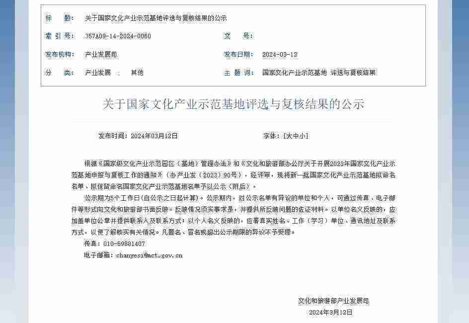 公司新闻 新一批国家文化产业示范基地公示,,918.com成功入围