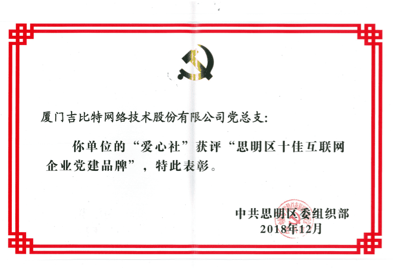 经初审评选、、、、网络评选和专家评审等环节,,,"厦门918.com网络技术股份有限公司党总支-爱心社" 从全区28个参评党建品牌中脱颖而出,,,获评"思明区十佳互联网企业党建品牌"。。。